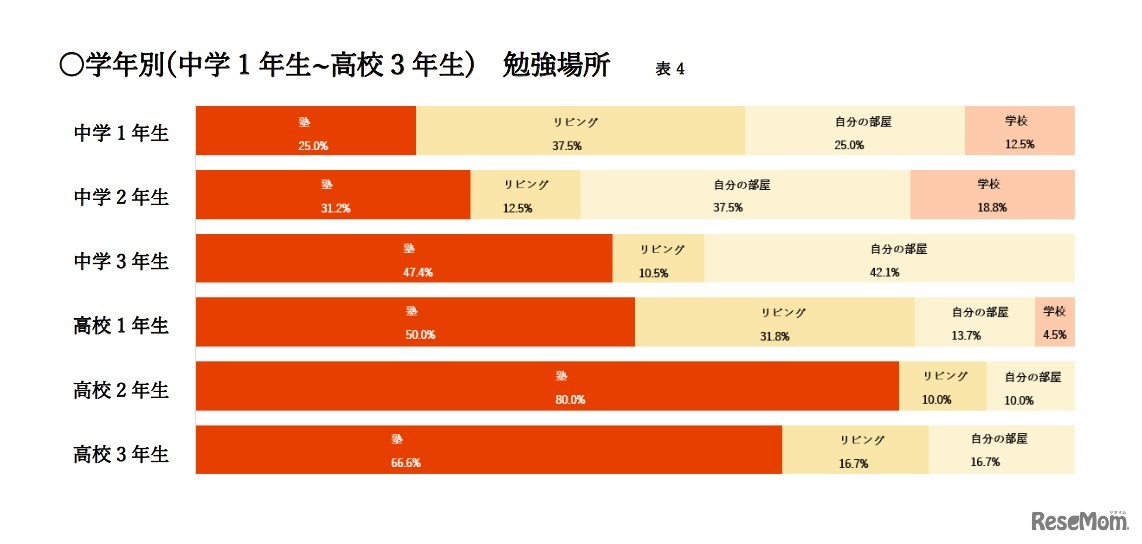 個別指導塾 WAYS調べ 学年別 勉強場所について