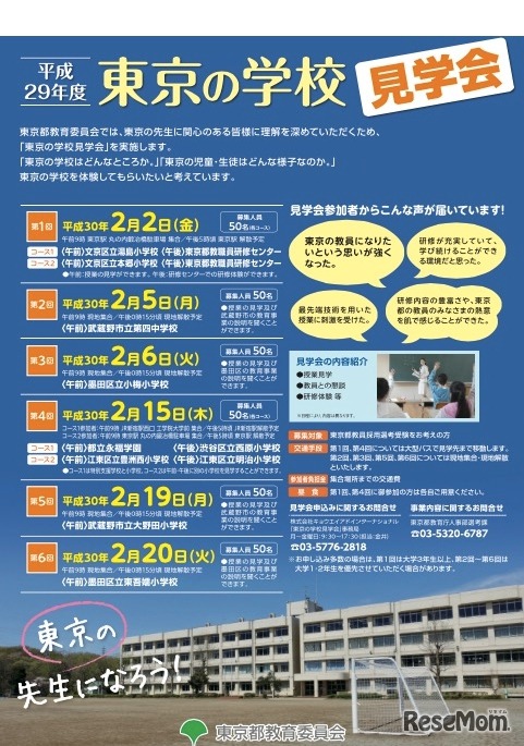 東京都教育委員会は、東京都教員採用選考の受験希望者を対象とした「東京の学校見学会」を平成30年(2018年)2月に全6回開催する。都内の公立小中学校や教職員研修センターを訪問し、授業見学や研修体験などを行う。申込みはWebサイトまたはFAXにて受け付ける。