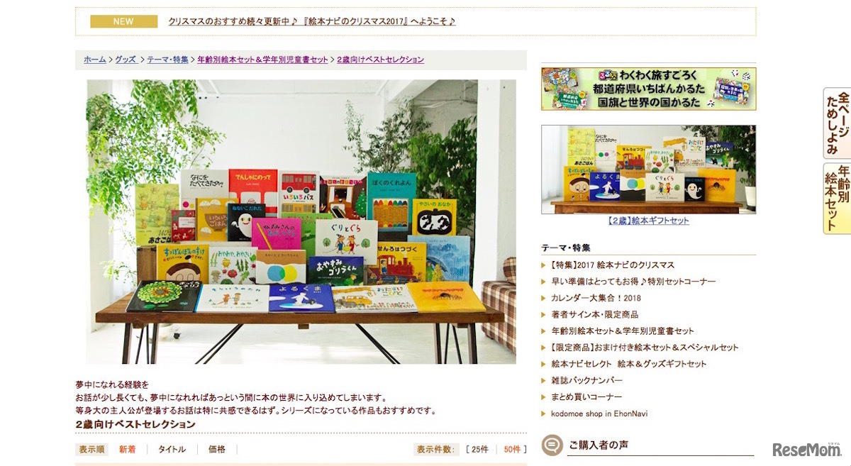 絵本の情報・通販サイト「絵本ナビ」を運営する絵本ナビは、Webサイトでクリスマス特設ページを展開している。年齢や予算、絵本のキャラクターなどから選べるさまざまなギフトを紹介。在庫がある商品であれば、2017年12月23日中の発送が可能だ。