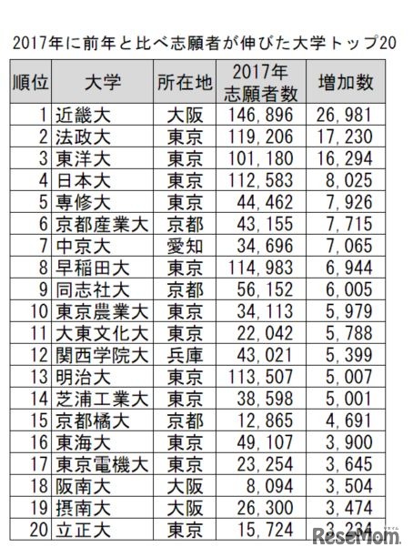 2017年に志願者がもっとも伸びた大学は「近畿大学」だったことが、大学通信の調査結果より明らかになった。志願者数が伸びた大学・学部トップ10は、近畿大学が5学部を占めた。