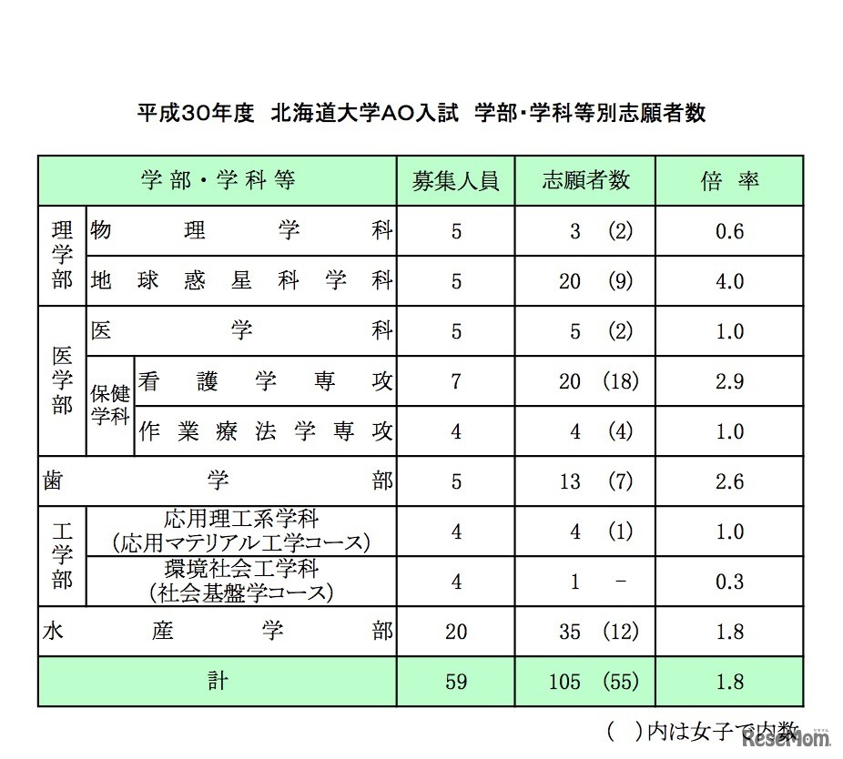 北海道大学 平成30年度AO入試 学部・学科別志願者数