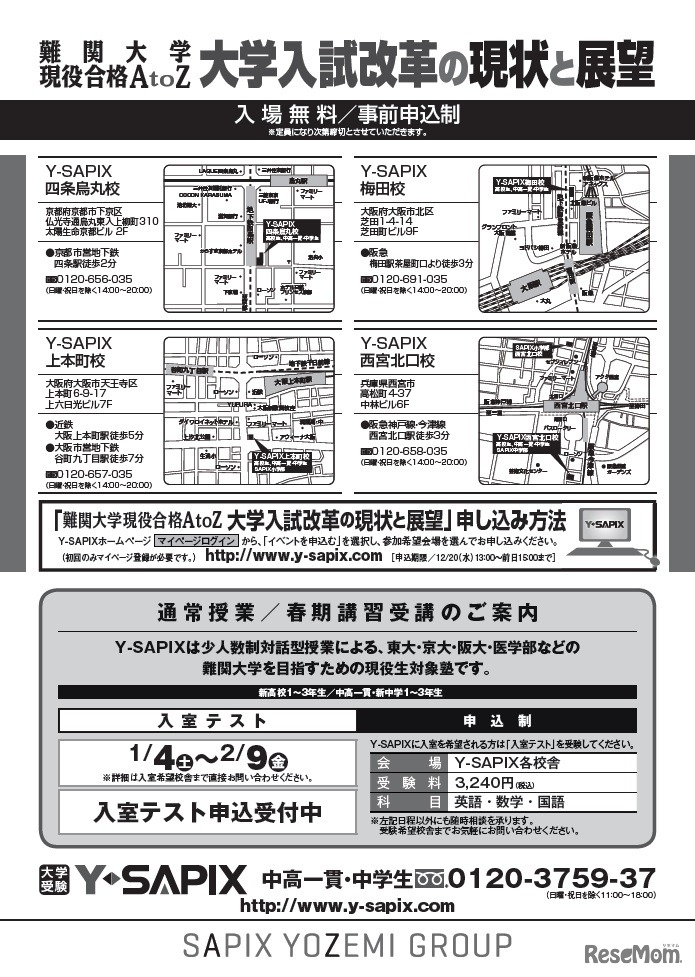 Y-SAPIXは2018年1月、難関大学を目指す小学生から新高校1年生(現中学3年生)までの生徒とその保護者を対象とした「難関大学現役合格A to Z 大学入試改革の現状と展望」を梅田校、西宮北口校、上本町校、四条烏丸校で開催する。入場無料だが、事前に申込みが必要。
