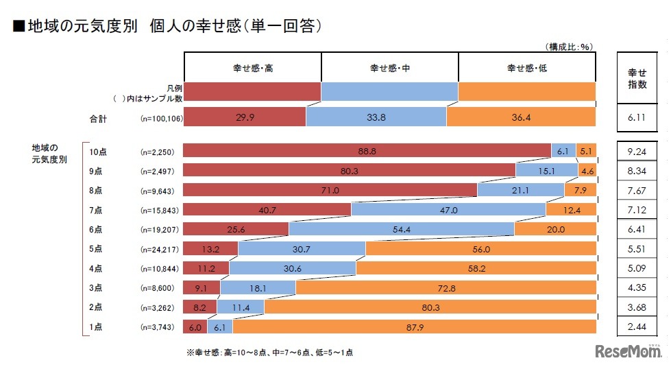 画像出典:アール・ピー・アイ「全国『地域元気指数調査2017』」 地域の元気度別 個人の幸せ感