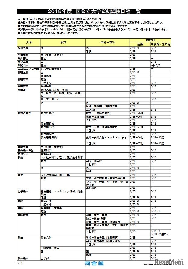 河合塾の大学入試情報サイト「Kei-Net」は2017年12月21日、2018年度入試情報として「国公立大学2次試験日程一覧」「私立大学入試日程・試験会場一覧」を更新した。国公立大学や私立大学の入試日程情報などをまとめている。