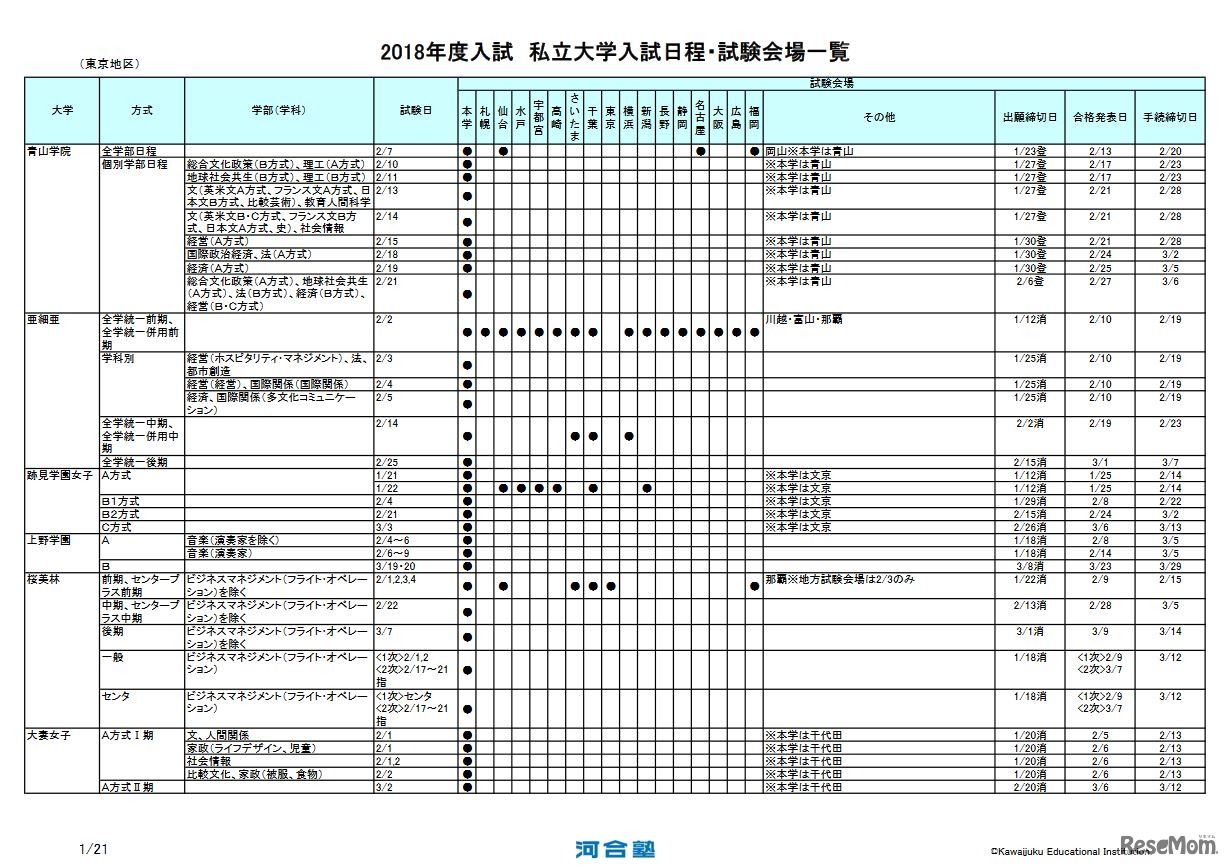 画像出典:河合塾 2018年度入試 私立大学入試日程・試験会場一覧(東京・一部)