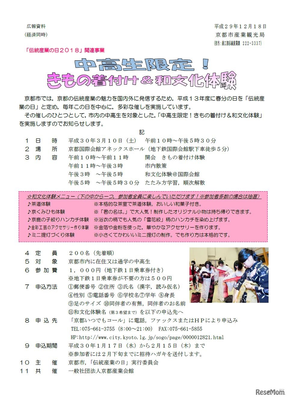 京都市は平成30年3月10日に「中高生限定!きもの着付け&和文化体験」を開催する。対象は京都市内に在住または通学している中高生で、先着順で200名を募集。「京都いつでもコール」の電話、FAX、Webサイトにて申込みを受け付ける。参加費は地下鉄1日乗車券付きで1,000円。