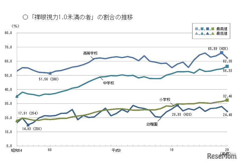 文部科学省は平成29年12月22日、平成29年度(2017年度)学校保健統計調査(速報)の結果概要を発表した。視力は、裸眼視力1.0未満の割合が小学校と中学校で過去最多となった。難聴以外の耳疾患の割合も小中高で過去最高値を記録した。