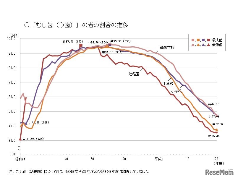 画像出典:文部科学省 平成29年12月22日「平成29年度学校保健統計速報の公表について」 「虫歯」の割合の推移