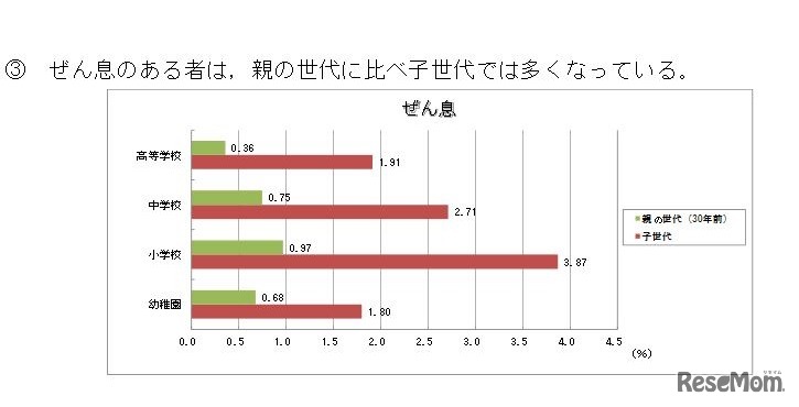 画像出典:文部科学省 平成29年12月22日「平成29年度学校保健統計速報の公表について」 喘息の世代間比較