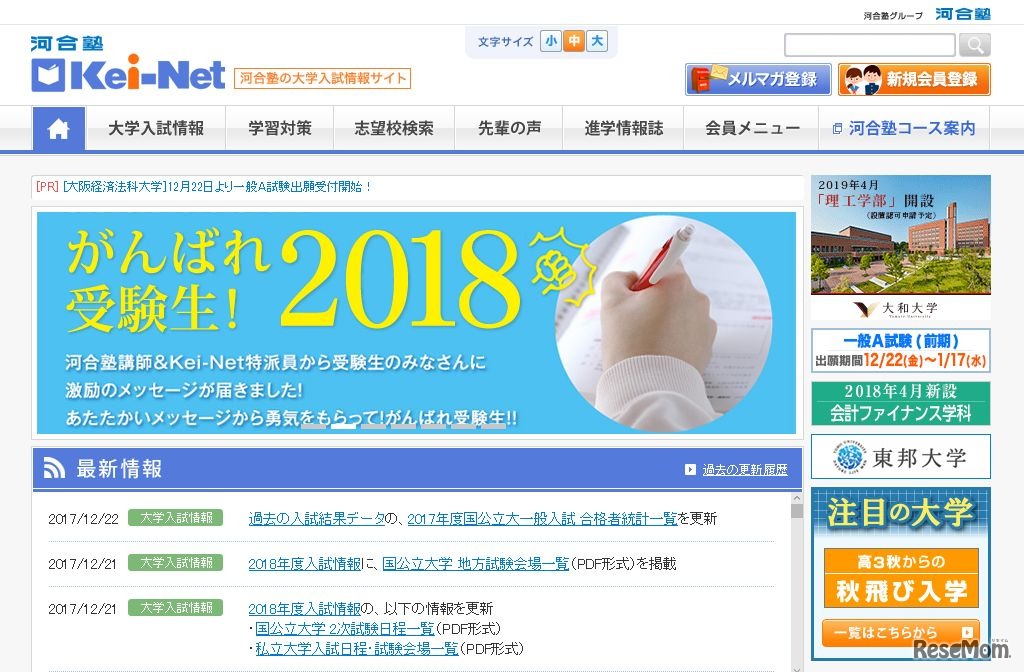 河合塾の大学入試情報サイト「Kei-Net」は2017年12月22日、「2017年度国公立大一般入試 合格者統計一覧」を更新した。一覧は、国公立大学一般入試の合格最高点・最低点・平均点を大学別にまとめたもので、全国7地域に分けて掲載している。