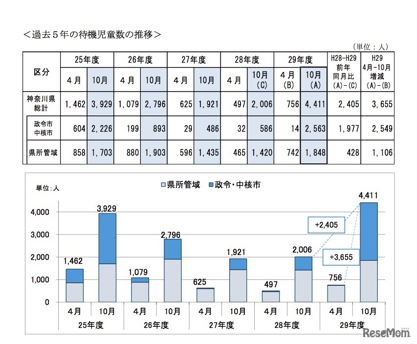 神奈川県は平成29年12月22日、保育所等利用待機児童数(平成29年10月1日現在)の状況をとりまとめ公表した。県内の待機児童数は4,411人となり、平成28年10月と比べて2,405人の増加。もっとも待機児童数が多い市町村は横浜市だった。