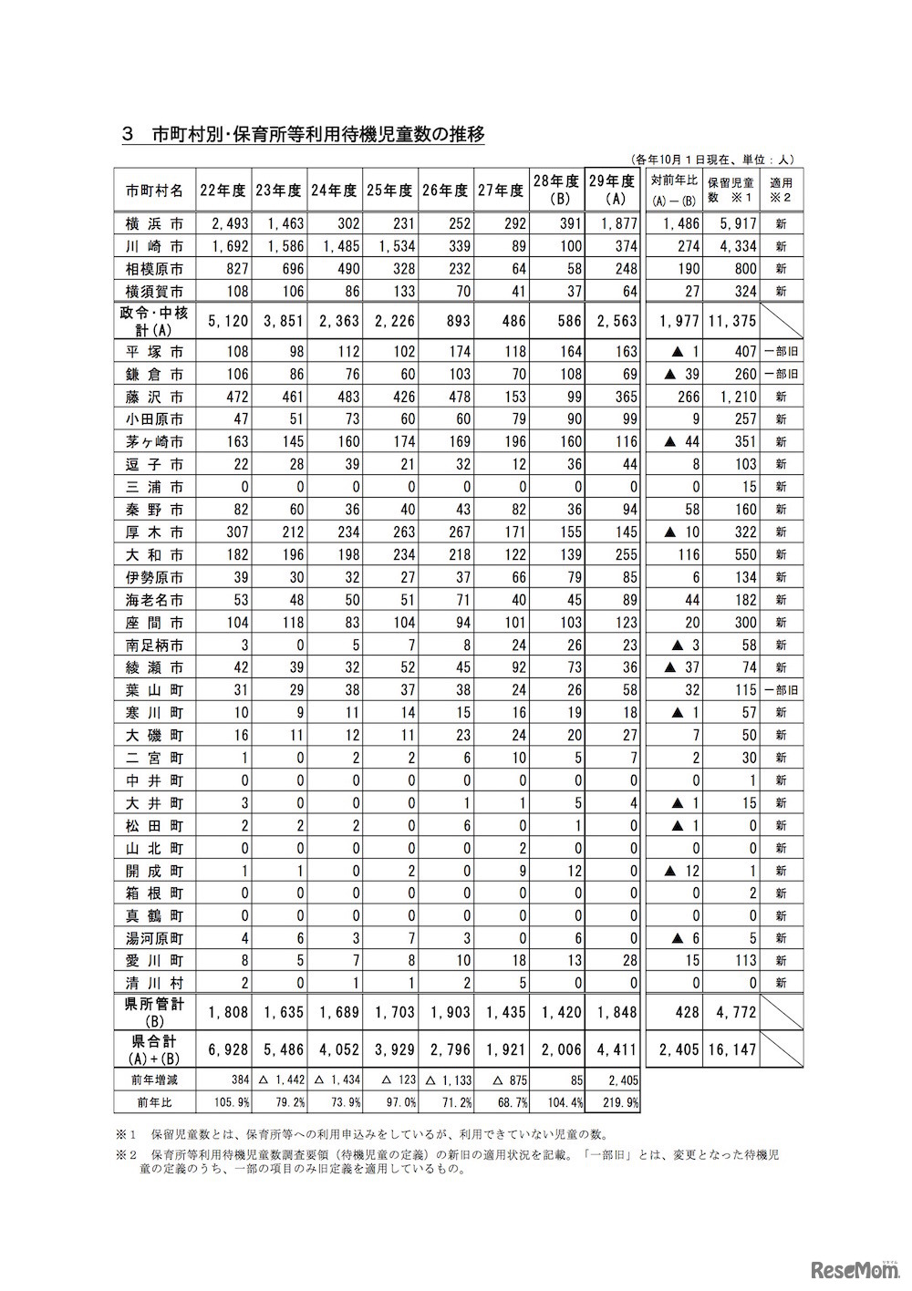 画像出典:神奈川県 平成29年12月22日発表「保育所等利用待機児童数(平成29年10月1日現在)の状況について」 市町村別・保育所等利用待機児童数の推移(各年10月1日現在)