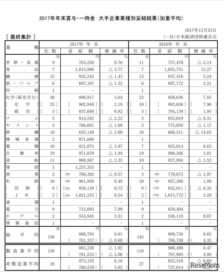 日本経済団体連合会(経団連)は2017年12月25日、大手企業を対象とした2017年年末賞与・一時金に関する最終集計結果を発表した。妥結額は平均88万793円で、2016年末と比べて0.01%増加。非製造業では6.16%増加した。