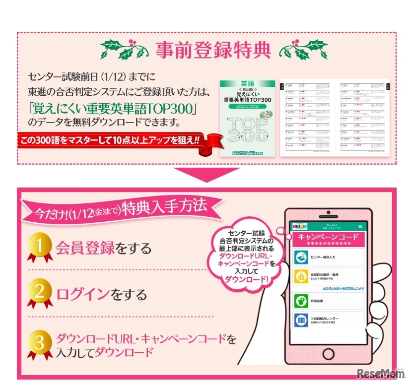 東進ドットコムは、高3生と高卒生を対象とした「センター試験合否判定システム」の登録を受け付けている。センター試験前日までに登録した場合、早期特典として「覚えにくい重要単語TOP300」のデータを無料ダウンロードできる。