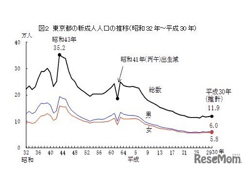 東京都は平成29年12月25日、「年男・年女」「新成人」「人口総数」の推計人口を発表した。戌年生まれは十二支別人口でもっとも少ない103万2,000人。新成人人口は、前年比1,000人増の11万9,000人。人口総数は前年同月より10万6,943人多い1,375万6,063人であった。