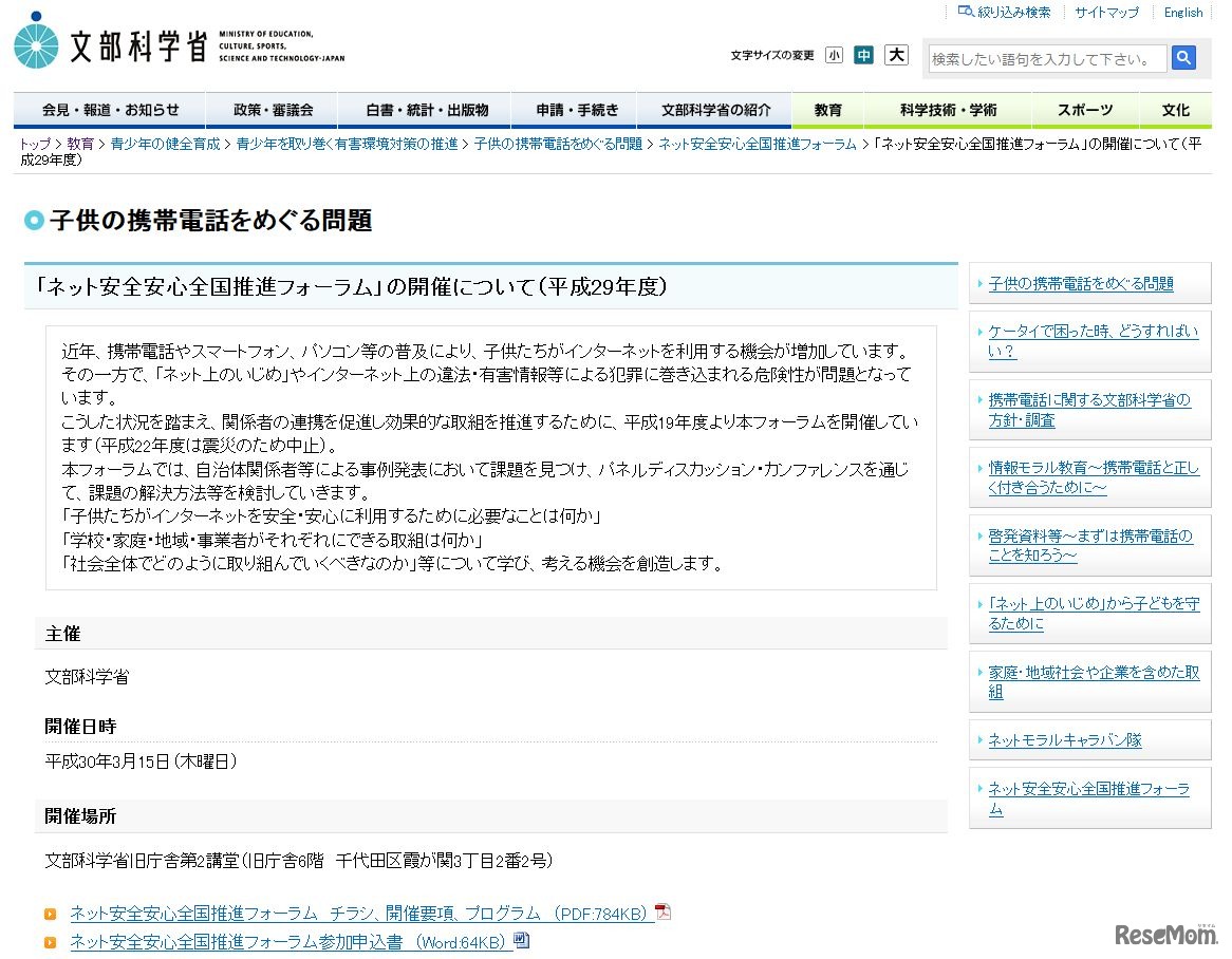 文部科学省は平成30年(2018年)3月15日、「平成29年度 ネット安全安心全国推進フォーラム」を開催する。対象は、保護者、学校関係者、青少年行政担当者、民間団体関係者や興味のある一般の人など、広く参加者を募る。定員は150名、参加無料。