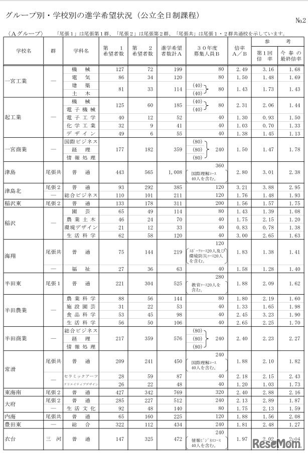 愛知県教育委員会は、平成30年(2018年)3月中学校卒業見込者の進路希望状況調査結果を発表した。平成29年12月5日現在、県内公立高校全日制への希望倍率は2.10倍。学校別では、松蔭(普通)の3.63倍がもっとも高かった。