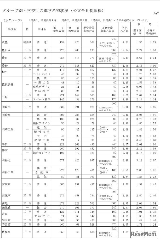 愛知県教育委員会は、平成30年(2018年)3月中学校卒業見込者の進路希望状況調査結果を発表した。平成29年12月5日現在、県内公立高校全日制への希望倍率は2.10倍。学校別では、松蔭(普通)の3.63倍がもっとも高かった。
