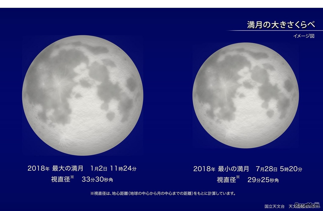 満月の大きさ比べ(イメージ図) (c) 国立天文台天文情報センター