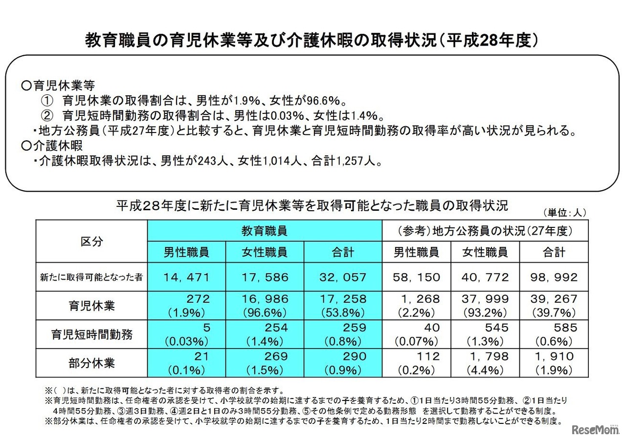 画像出典:文部科学省 平成29年12月27日「平成28年度公立学校教職員の人事行政状況調査について(概要)」 教育職員の育児休業等および介護休暇の取得状況(平成28年度)