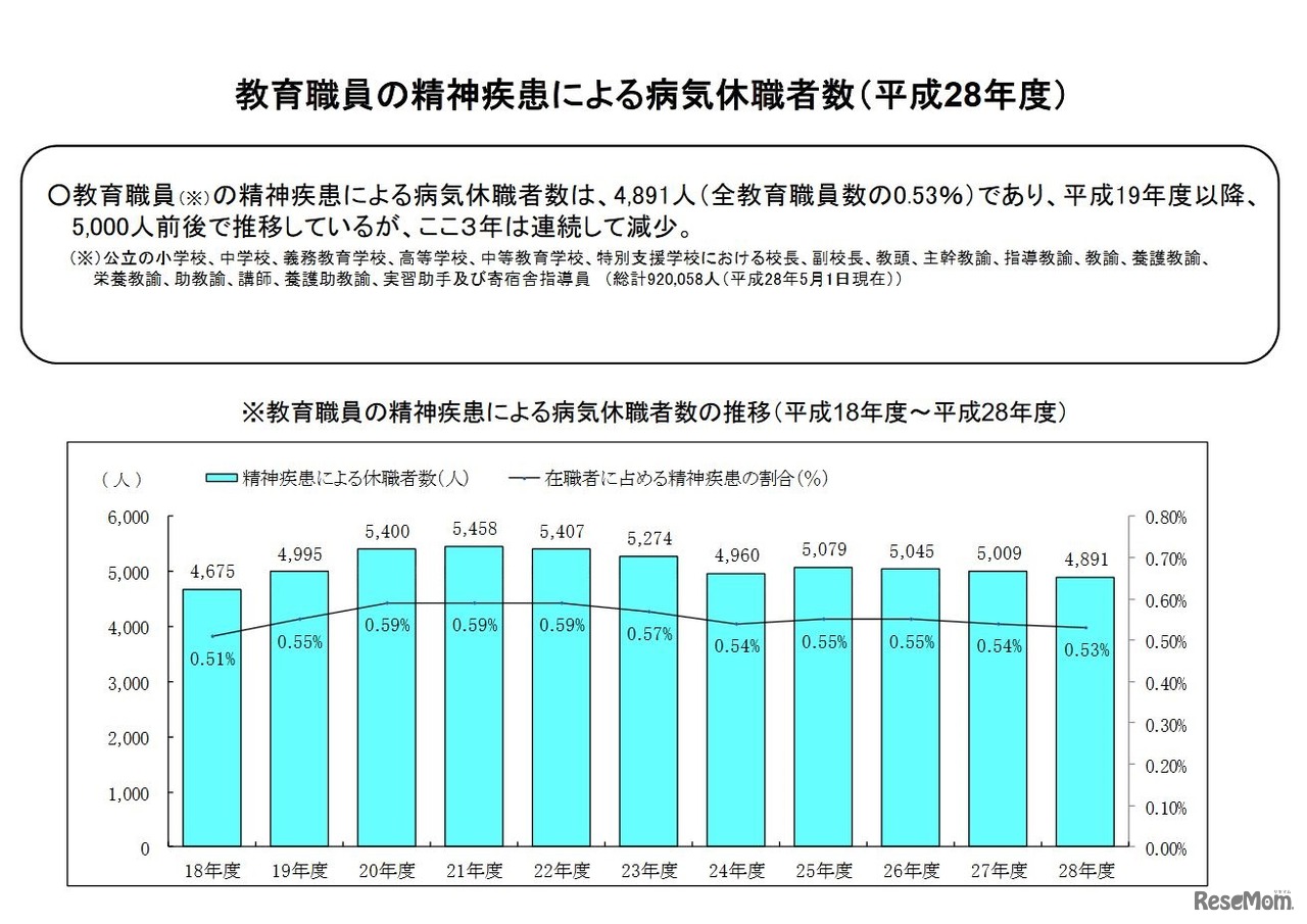 画像出典:文部科学省 平成29年12月27日「平成28年度公立学校教職員の人事行政状況調査について(概要)」 教育職員の精神疾患による病気休職者数(平成28年度)