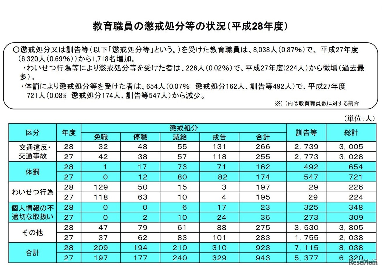 教育職員の懲戒処分等の状況(平成28年度)