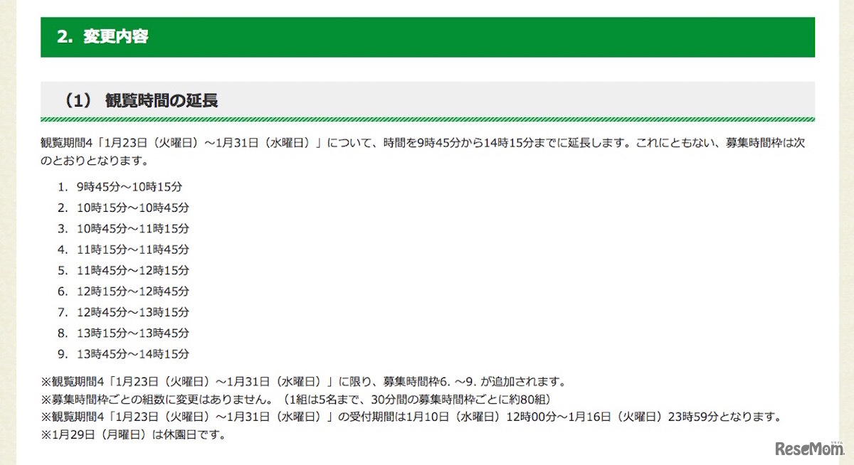平成29年12月19日から一般公開を開始した恩賜上野動物園のジャイアントパンダ「シャンシャン」と母親の「シンシン」。公開期間4期となる平成30年1月23日~31日は、観覧時間を午後2時15分までと2時間延長することが発表された。1月10日より申込みを開始している。