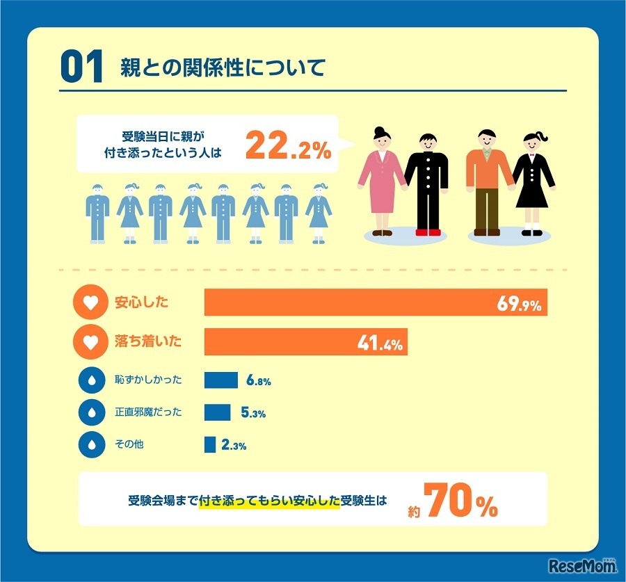 受験会場へ親が付き添った受験生は22.2%であることが、河合塾の調査結果より明らかになった。親の付添いについて、「安心した」「落ち着いた」など好意的な意見が多く、「恥ずかしかった」「正直邪魔だった」という意見は少数派だった。