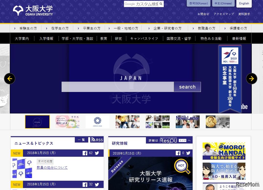 平成29年度の一般入試前期日程などの理科(物理)における出題および採点ミスがあった大阪大学。同大学は1月30日までに平成30年4月からの入学者をまとめ、1月31日に詳細を取りまとめる。