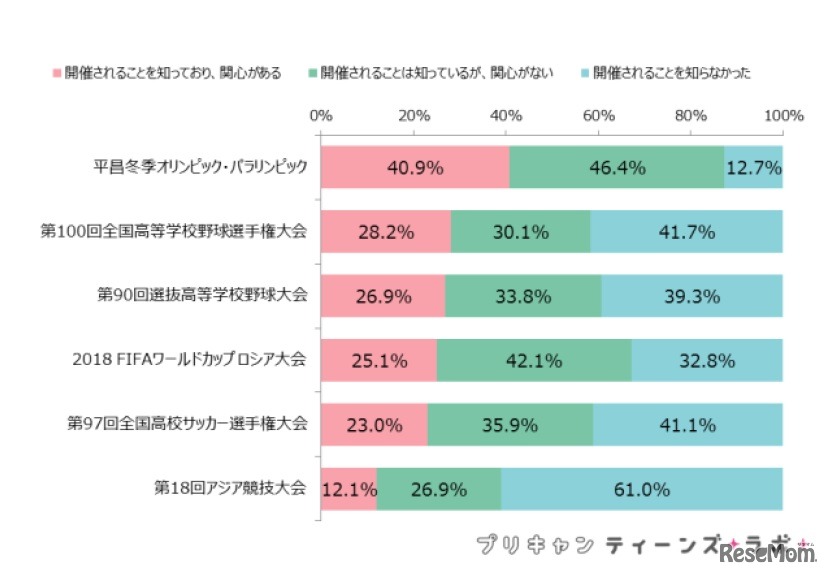 画像出典:プリキャンティーンズラボ「女子中高生とスポーツに関する調査」 2018年に開催されるスポーツイベントへの関心度