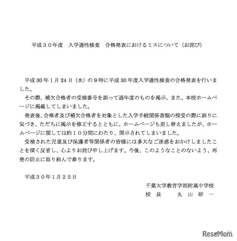 千葉大学教育学部附属中学校は平成30年1月25日、平成30年度(2018年度)入学適性検査の合格発表において、補欠合格者の受検番号を誤って掲示したことを発表した。発表の際に判明し、ただちに修正・再掲したが、Webサイトは約10分間開示されていたという。
