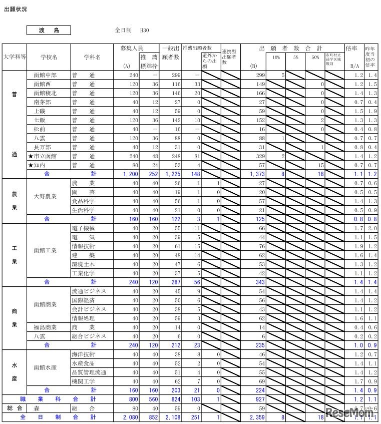 画像出典:北海道教育委員会 平成30年度北海道公立高等学校入学者選抜の出願状況(渡島・1月25日正午現在)
