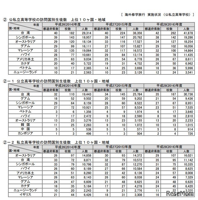 平成28年度(2016年度)の海外修学旅行実施率は、公立高校が10.4%、私立高校が34.9%で、旅行先は「台湾」がもっとも多く、262校・4万1,878人が訪問したことが、全国修学旅行研究協会の調査結果より明らかになった。