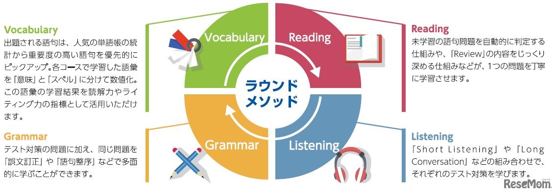 Reading、Listening、Grammar、Vocabularyのスキルを相互に学習する「ラウンドメソッド」