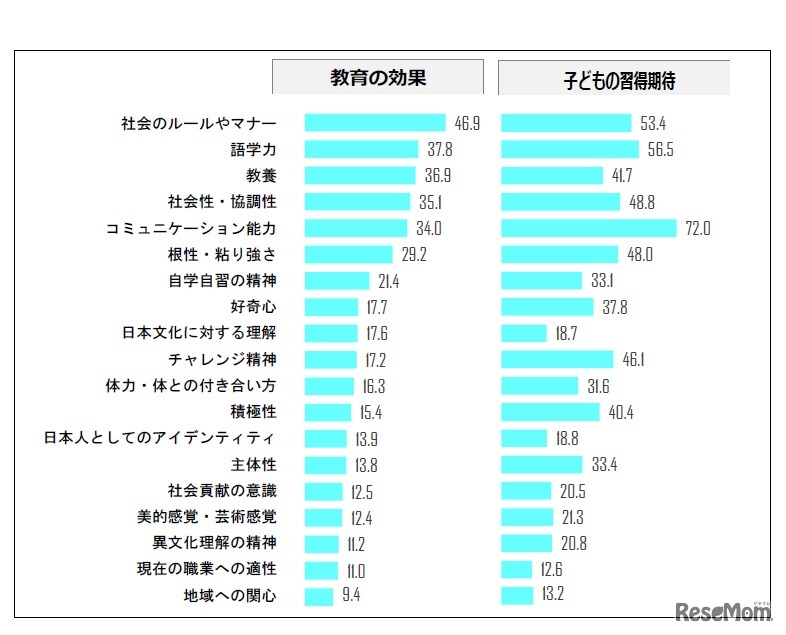 画像出典:公文教育研究会「家庭学習調査2017」 教育の効果とわが子への習得期待について