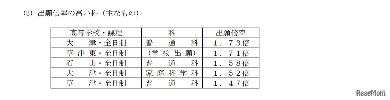 滋賀県教育委員会は平成30年2月22日、平成30年度(2018年度)滋賀県公立高等学校の一般入試について、願書受付締切後の2月21日午後4時40分時点の志願状況・倍率(中間発表)を発表した。学校別の志願倍率は、膳所1.30倍など。