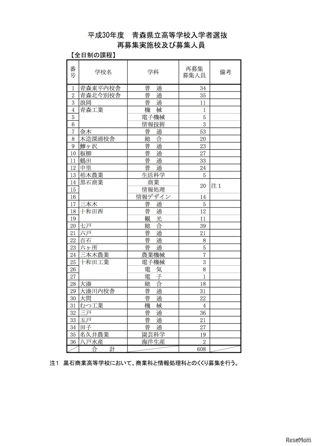 青森県教育委員会は平成30年3月14日、平成30年度(2018年度)青森県立高等学校入学者選抜の再募集実施校および募集人員を発表した。県内全域では全日制29校で608人を募集。入学願書受付期間は3月15日から16日まで。