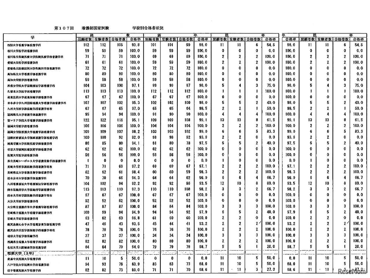 第107回 看護師国家試験 学校別合格者状況:大学-短期大学3年