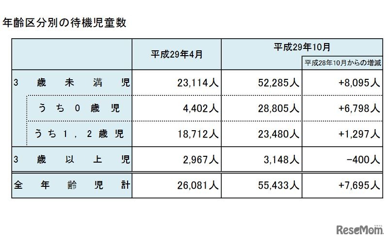 厚生労働省は平成30年4月11日、保育園などの待機児童数の状況を発表した。平成29年10月1日時点の待機児童数は5万5,433人で、3年連続の増加となった。0歳児を中心に年度途中の申込みが増え、平成29年4月1日からの半年間で倍増している。