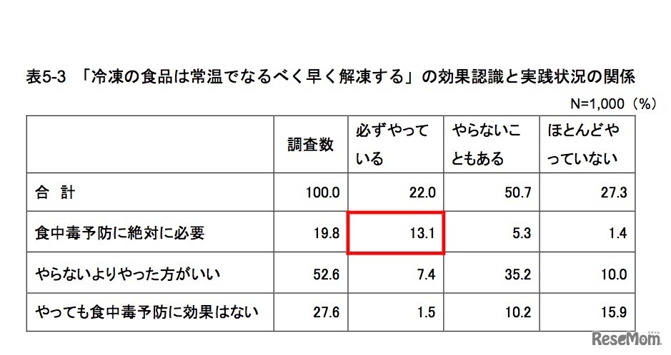 本調査「『冷凍の食品は常温でなるべく早く解凍する』の効果認識と実践状況の関係」