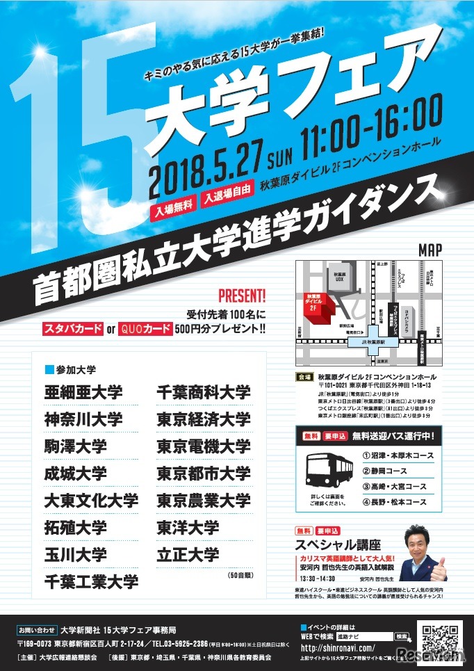 大学広報連絡懇談会は2018年5月27日、首都圏私立大学進学ガイダンス「15大学フェア」を秋葉原ダイビル2Fコンベンションホールで開催する。安河内哲也先生による英語入試解説や、日本英語検定協会による「英語4技能試験検定の概要と説明」も行われる。