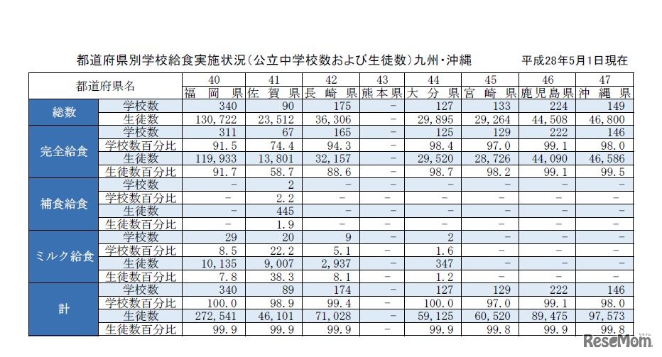 平成28年5月1日現在、国公私立学校において学校給食を実施している学校数は全国で2万9,959校、実施率は95.0%だった。また、完全給食の実施率は92.6%で、小学校および中学校において昨年度(92.3%)より増加していることがわかった。
