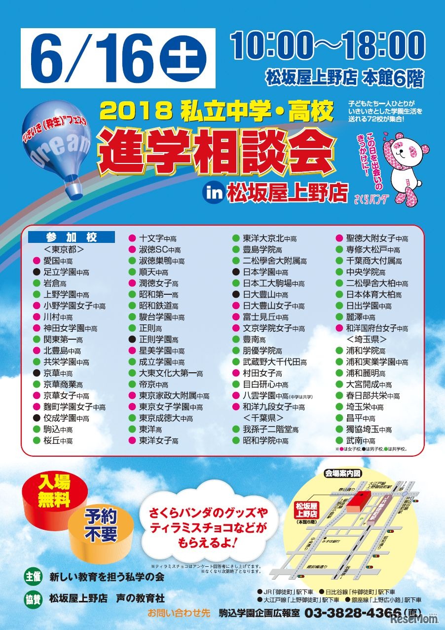 新しい教育を担う私学の会は2018年6月16日、松坂屋上野店で「2018私立中学・高校進学相談会in松坂屋上野店」を開催する。入場無料、予約不要。首都圏の私立中学・高校72校が参加する。
