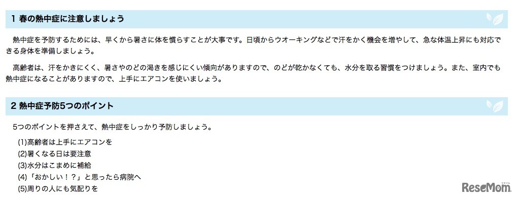 埼玉県は平成30年4月27日、Webサイトに「熱中症予防5つのポイント」を掲載。熱中症は夏だけでなく、体が気温の上昇に慣れていない春にも発生することがあるため、水分をこまめに補給するなど暑くなる日は注意するよう呼びかけている。