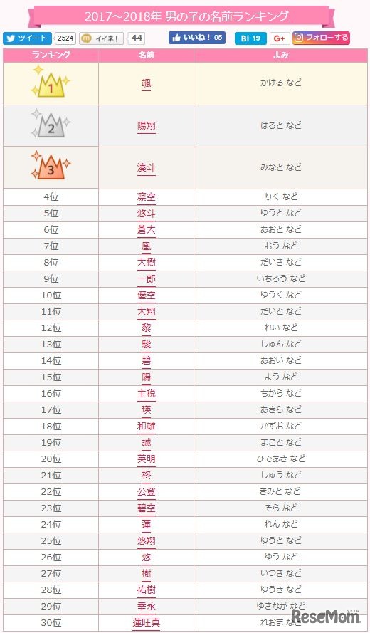 スマートフォン向けアプリ「赤ちゃん名づけ」を提供するリクスタは2018年5月1日、「2017~2018年 男の子の名前ランキング」を発表した。1位「颯」、2位「陽翔」、3位「湊斗」で、自然を表す漢字が含まれる名前が上位に並んだ。