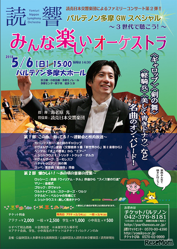 読売日本交響楽団によるファミリーコンサート「みんな楽しいオーケストラ ~3世代で聴こう!~」が2018年5月6日に、パルテノン多摩GWスペシャルとしてパルテノン多摩 大ホールで開催される。