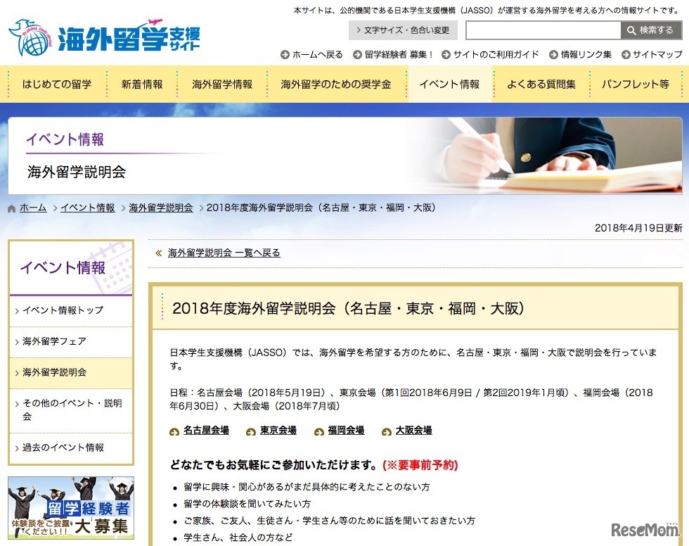 JASSO「海外留学説明会」5/19より、東京・名古屋・大阪・福岡 1枚目の写真・画像