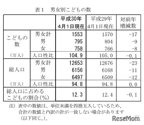 総務省は5月5日の「こどもの日」にちなんで、平成30年4月1日現在の15歳未満人口を公表した。15歳未満の子どもの数は1,553万人と37年連続で減少。前年に比べ増加しているのは東京都だけだった。