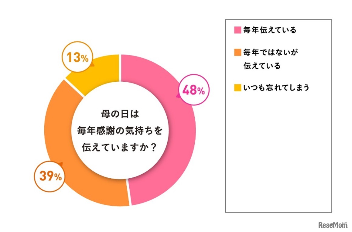 20代から30代の女性の77%は、家族の中で1番尊敬する人に「母親」をあげていることが、ミュゼマーケティングによる調査からわかった。回答者の半数近くは、毎年「母の日」に感謝を伝えており、プレゼントやお花を贈る人が多い。