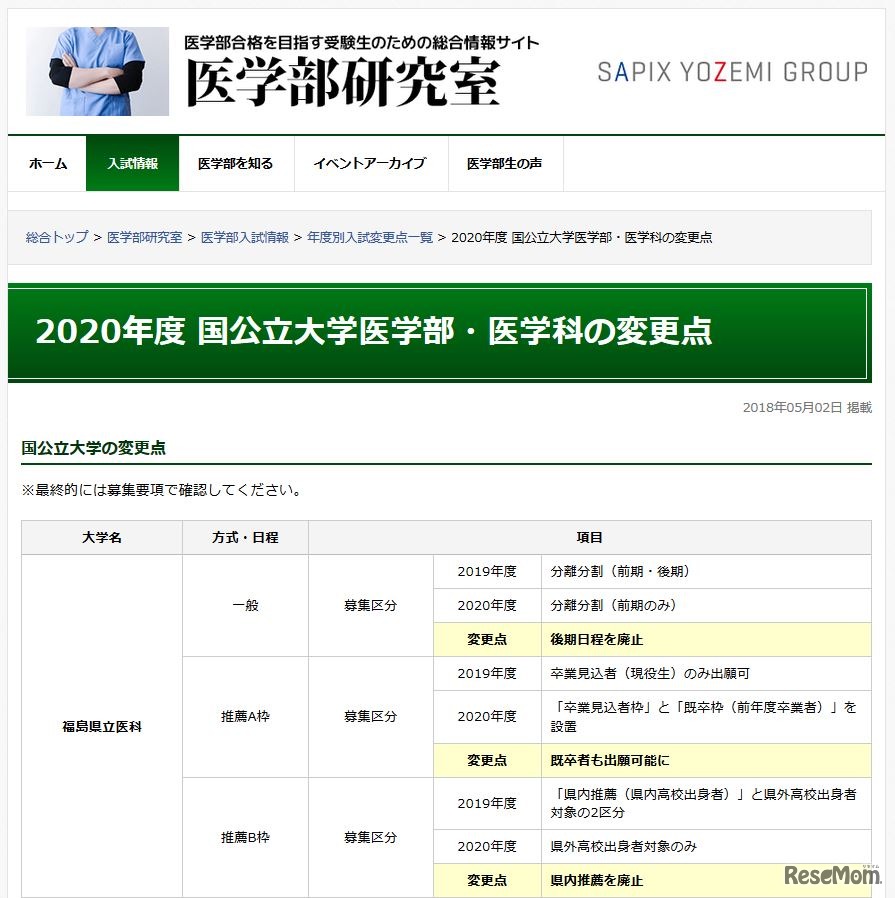 SAPIX YOZEMI GROUPの医学部入試情報サイト「医学部研究室」は2018年5月2日、「2019年度国公私立大学医学部・医学科」「2020年度国公立大学医学部・医学科」の変更点について、最新情報を掲載した。特色入試やAO入試の導入など、変更内容を一覧にしている。